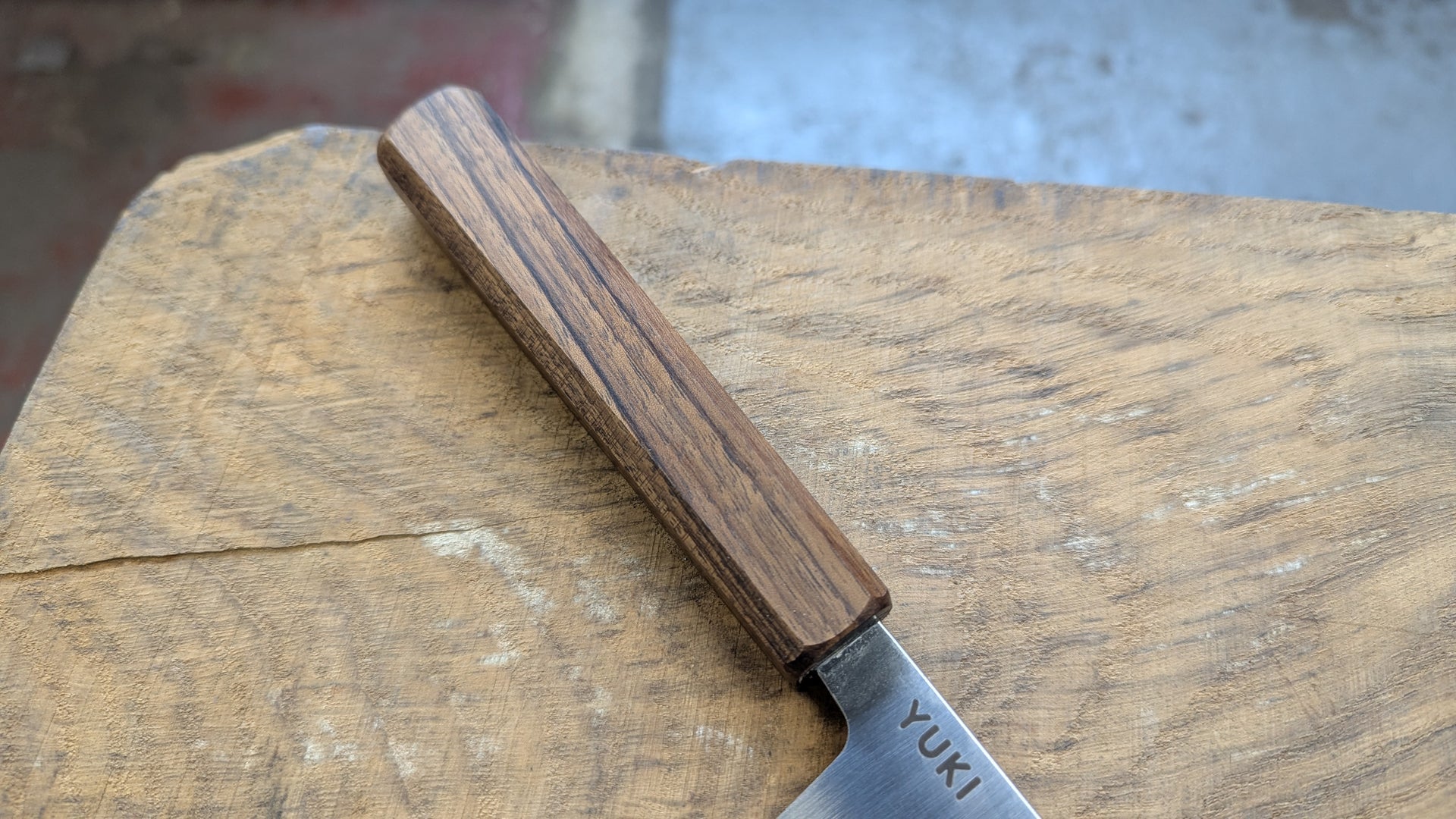 This paring knife is a super useful tool for the kitchen. It is perfect for those smaller tasks like garlic, shallots, chillies etc. Or just for those who prefer using a smaller blade. The steel is very hard and very thin so will perform beautifully and keep an edge for a long time as long as it is looked after properly.