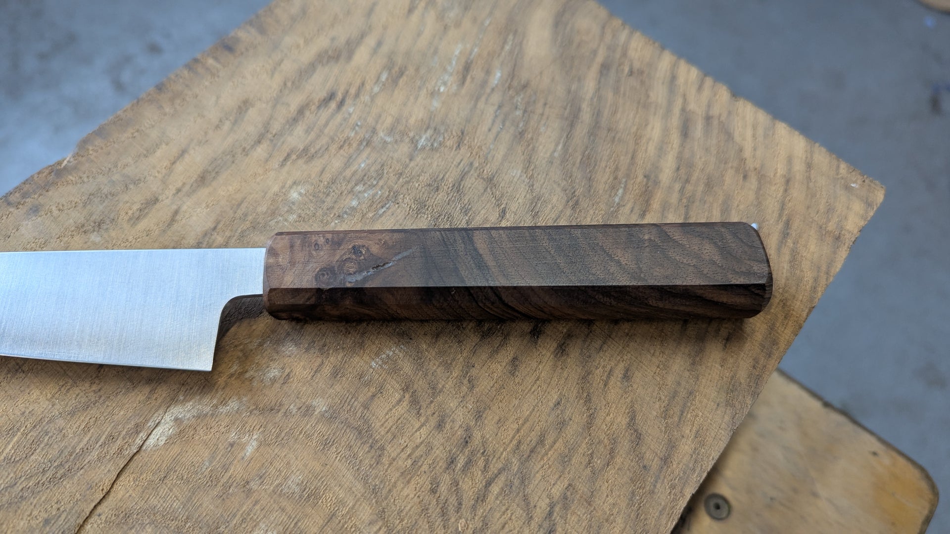This paring knife is a super useful tool for the kitchen. It is perfect for those smaller tasks like garlic, shallots, chillies etc. Or just for those who prefer using a smaller blade. The steel is very hard and very thin so will perform beautifully and keep an edge for a long time as long as it is looked after properly.
